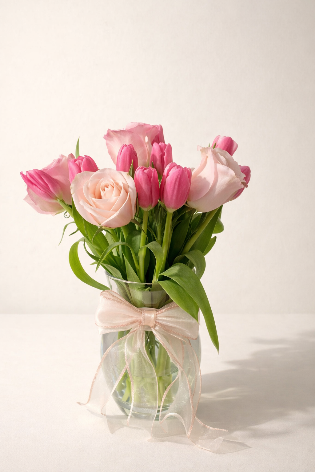 Tulipanes rosados y rosas rosé en florero de vidrio, un arreglo delicado y romántico con sello Fioretta.