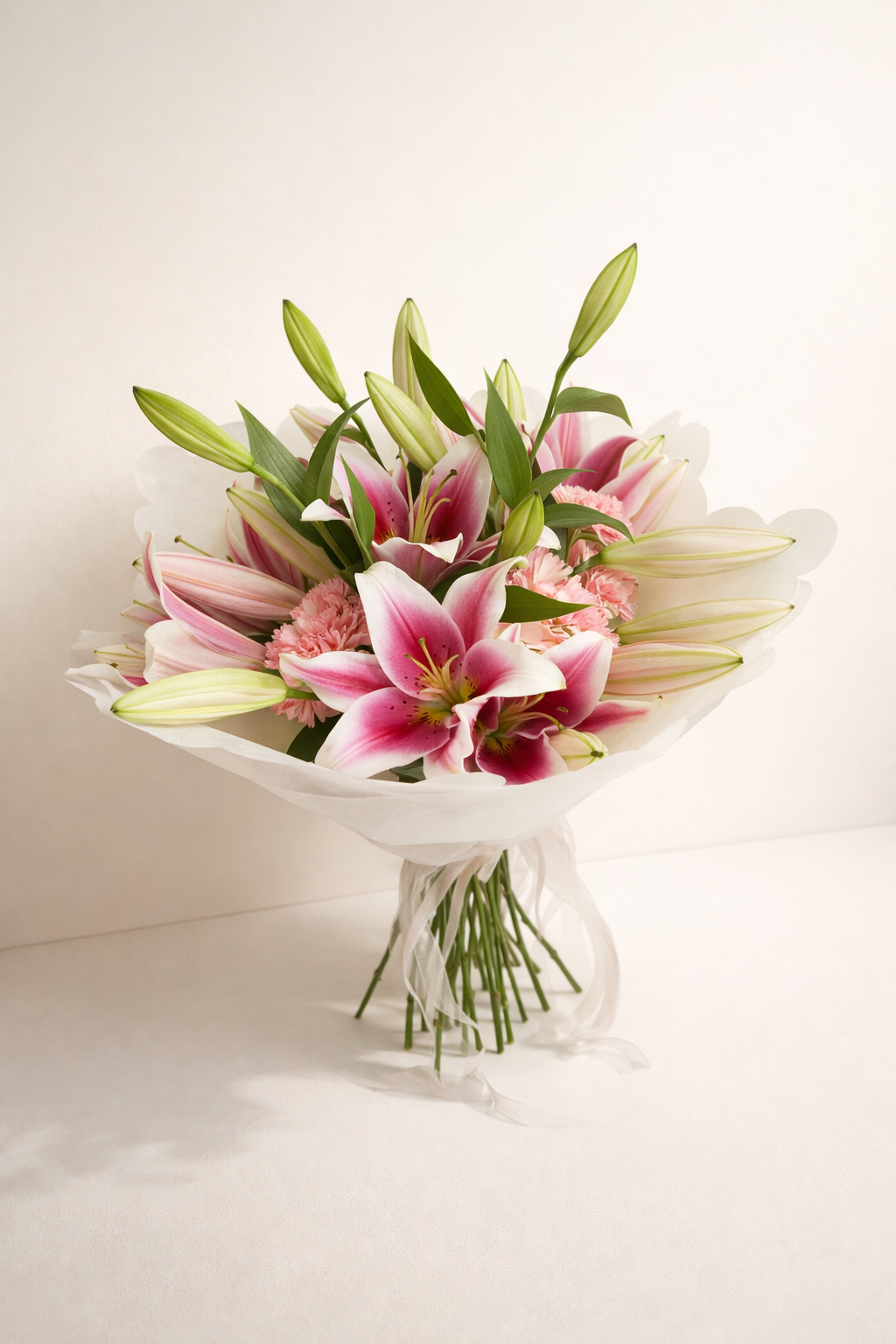 Ramo Encanto Floral Fioretta con lirios rosados y claveles, arreglo floral elegante y delicadoEncanto Floral Fioretta
