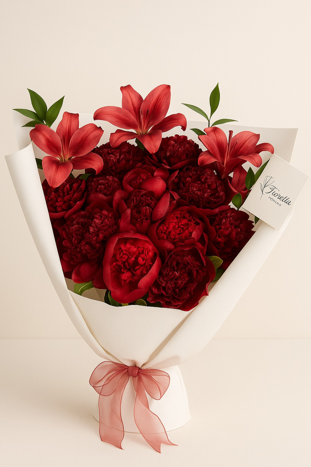 Ramo romántico premium en tonos rojos carmesí, diseñado para expresar pasión y amor eterno. Ideal para ocasiones especiales. Disponible con flores a domicilio en Santiago de Chile.