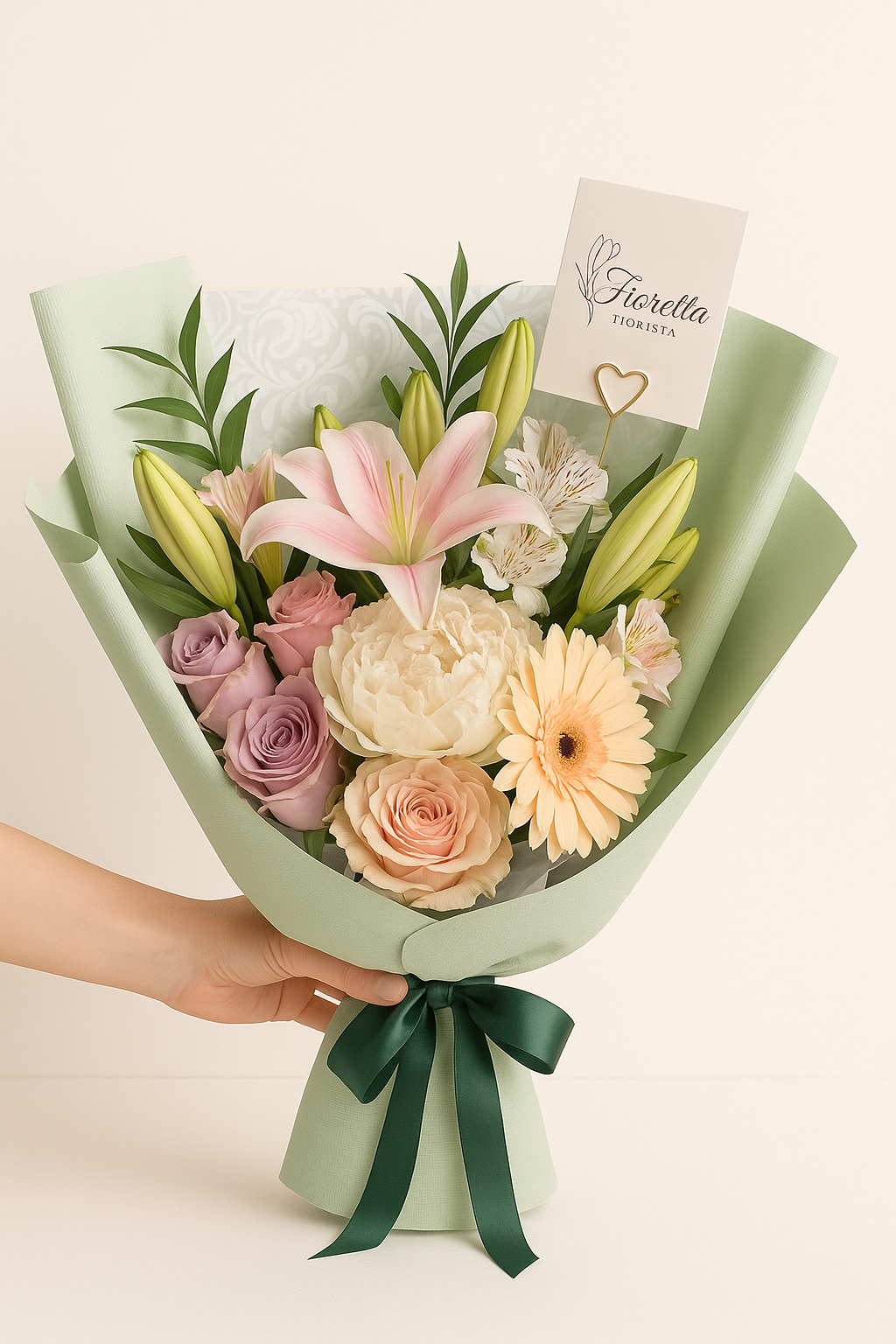 Serenidad Fioretta es un delicado ramo en tonos pastel con rosas, lirios y gerberas. Un diseño elegante y fresco ideal para cumpleaños, agradecimientos y regalos especiales.