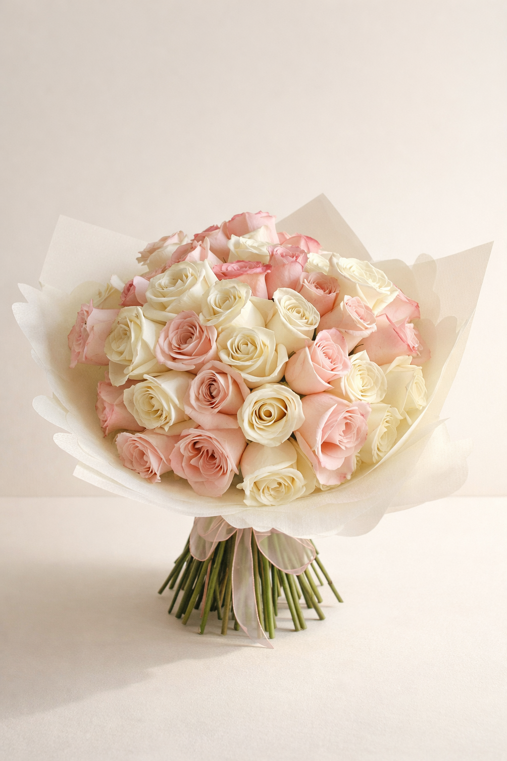 Ramo Rose Clásico Fioretta con rosas rosadas y blancas, arreglo floral elegante y románticoRosé Clásico Fioretta