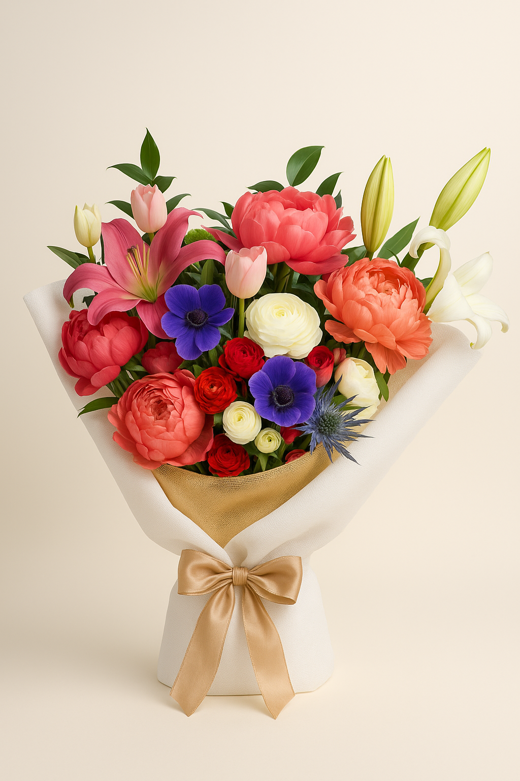 Hay arreglos que parecen creados para personas que realmente aman las flores. El ramo Sueño de Sofía Fioretta celebra la armonía entre lo romántico y lo moderno, combinando peonías coral, tulipanes rosados, anémonas violetas y ranúnculos blancos en una sinfonía llena de vida y sutileza. Su envoltura en lino marfil con lazo champagne realza el contraste de tonos y refleja la esencia de Fioretta: elegancia, feminidad y encanto natural. Un detalle pensado para quienes disfrutan rodearse de belleza, color y pequeños momentos que iluminan el alma.